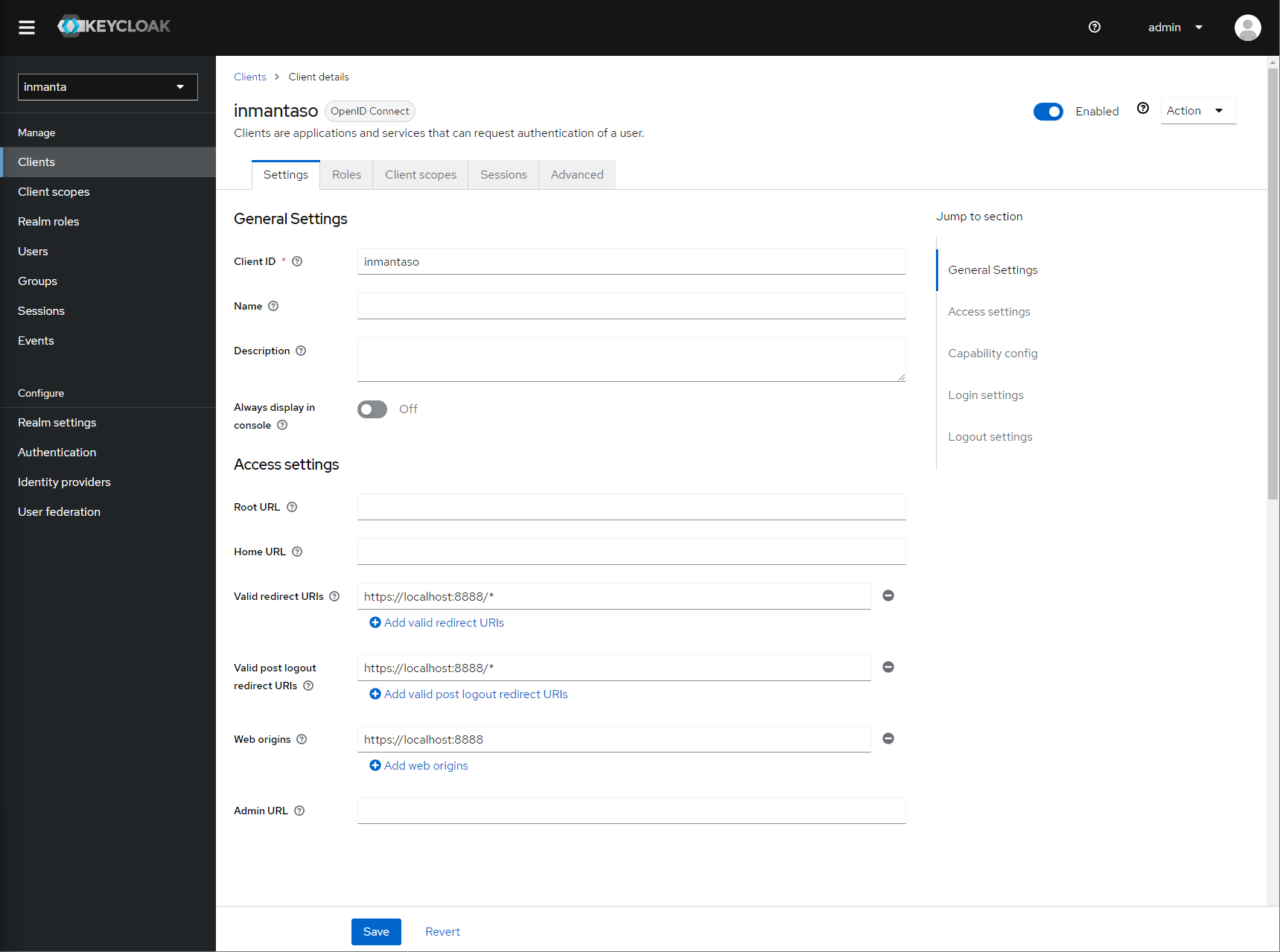 Clients in the master realm. Click the create button to create an inmanta client.¶