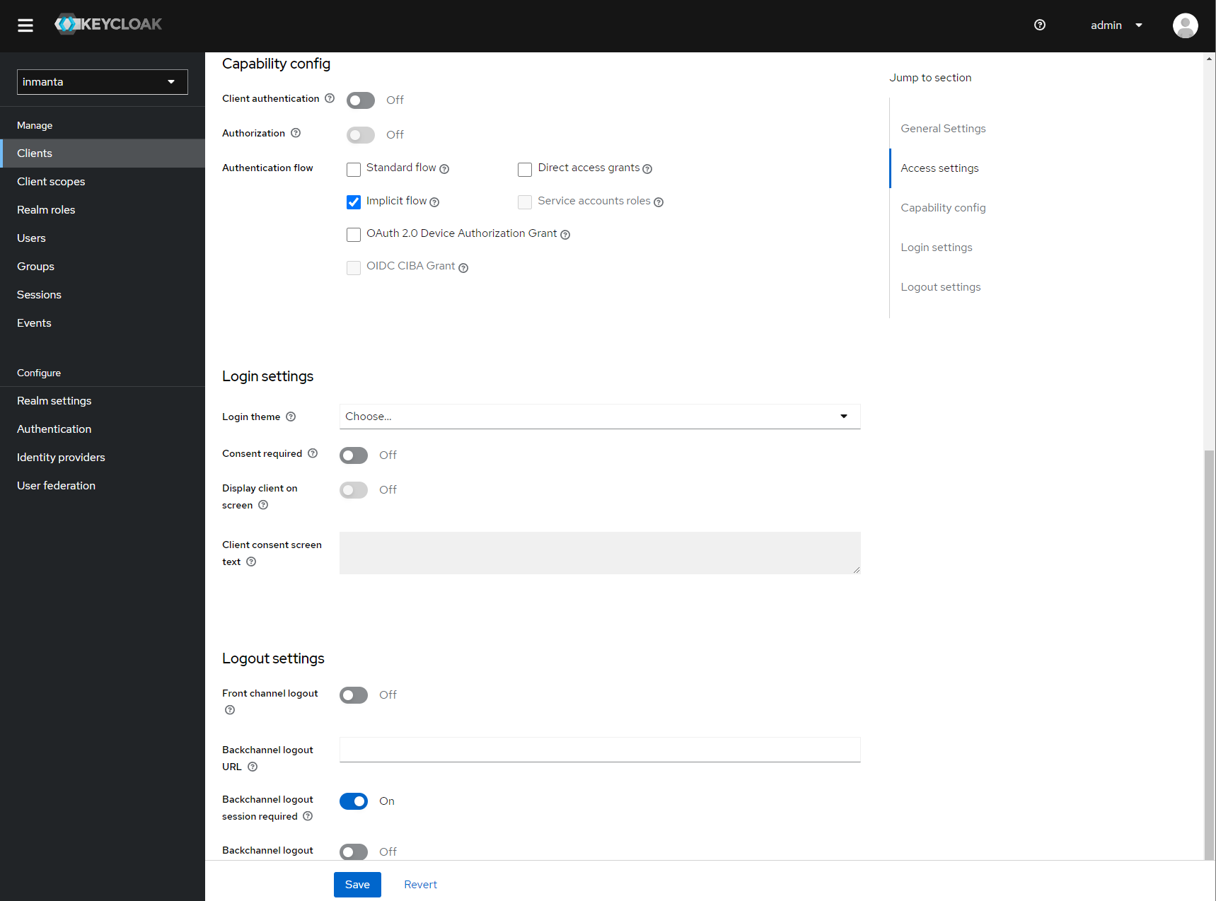 After clicking save, keycloak opens the configuration of the client. Modify the client to allow implicit flows and add valid redirect URIs and valid post logout redirect URIs. As a best practice, also add the allowed web origins. See the screenshot below as an example.