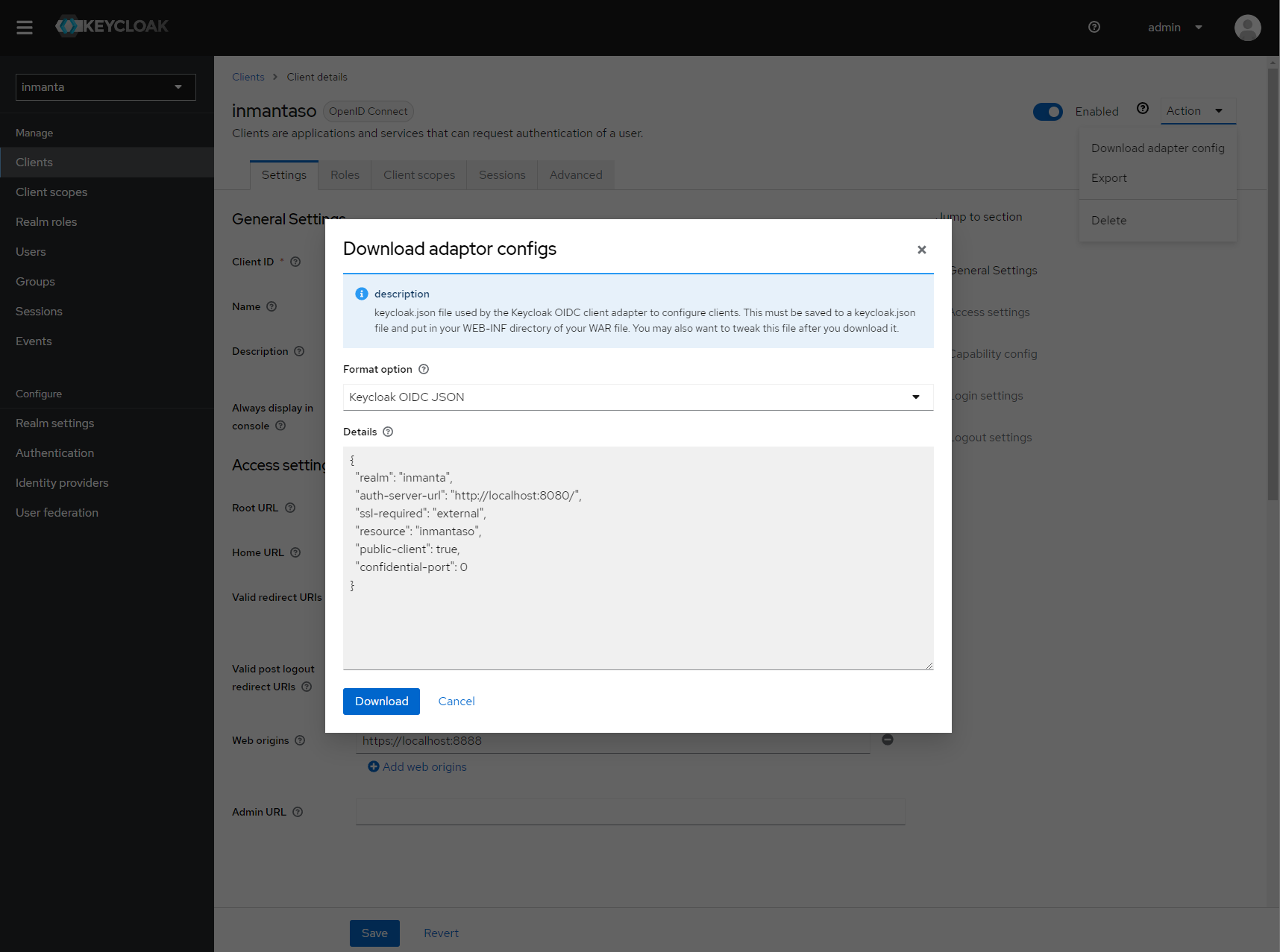 Select JSON format in the select box. This JSON string provides you with the details to configure the server correctly to redirect web-console users to this keycloak instance and to validate the tokens issued by keycloak.