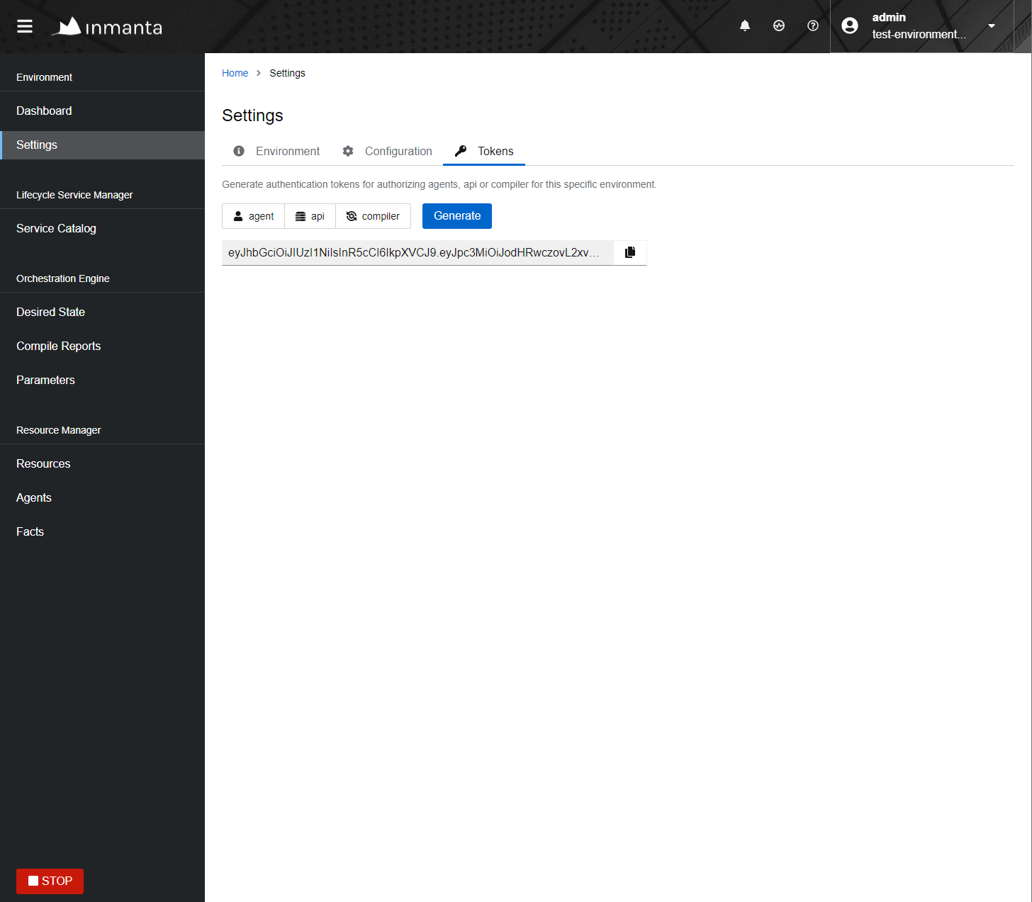 A token can be retrieved either with inmanta-cli token create or via the web-console using the tokens tab on