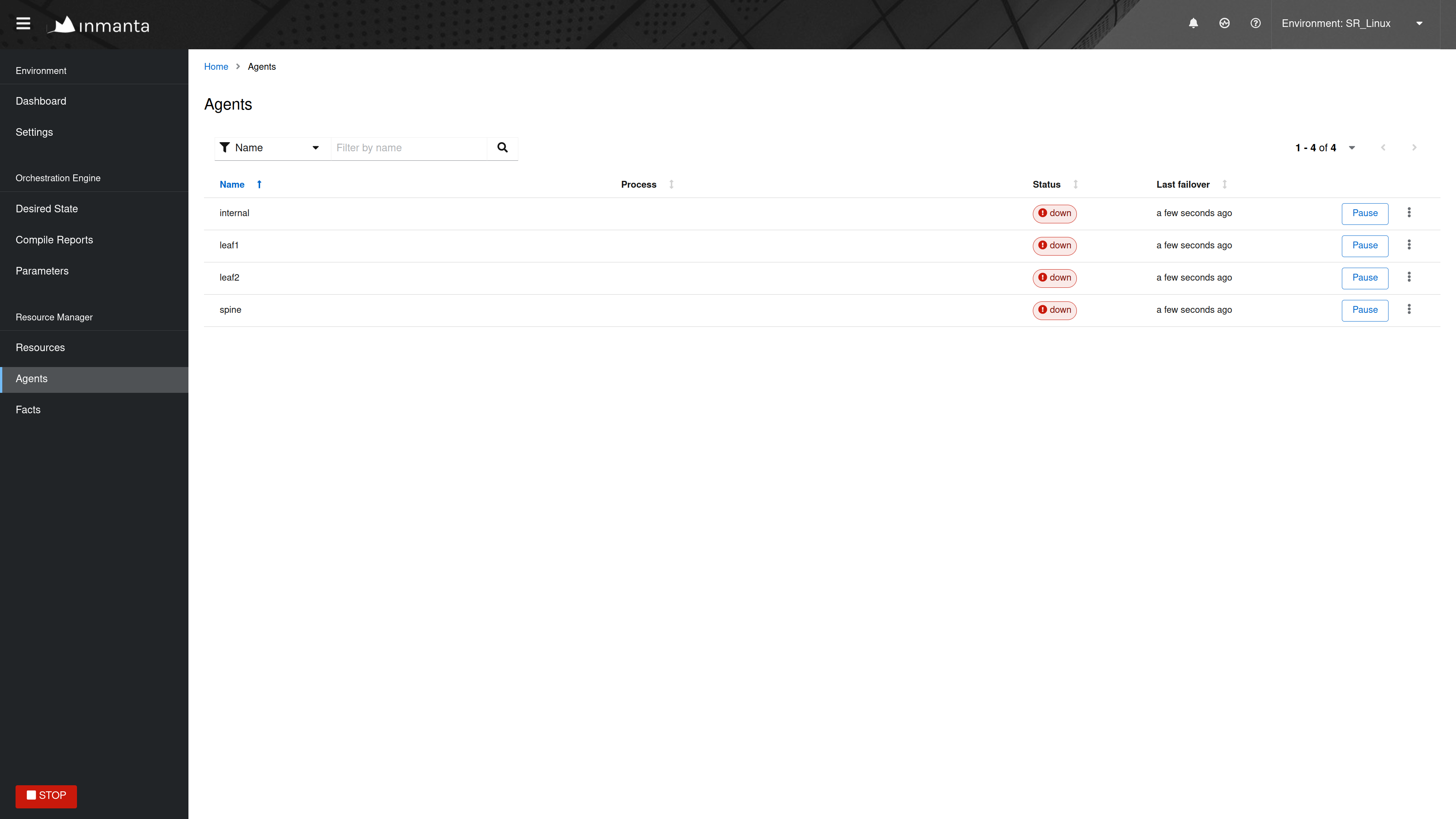 This section explains how to troubleshoot the problem where an agent is in the down state while it should be up. In the figure shown below, the four agents are down.