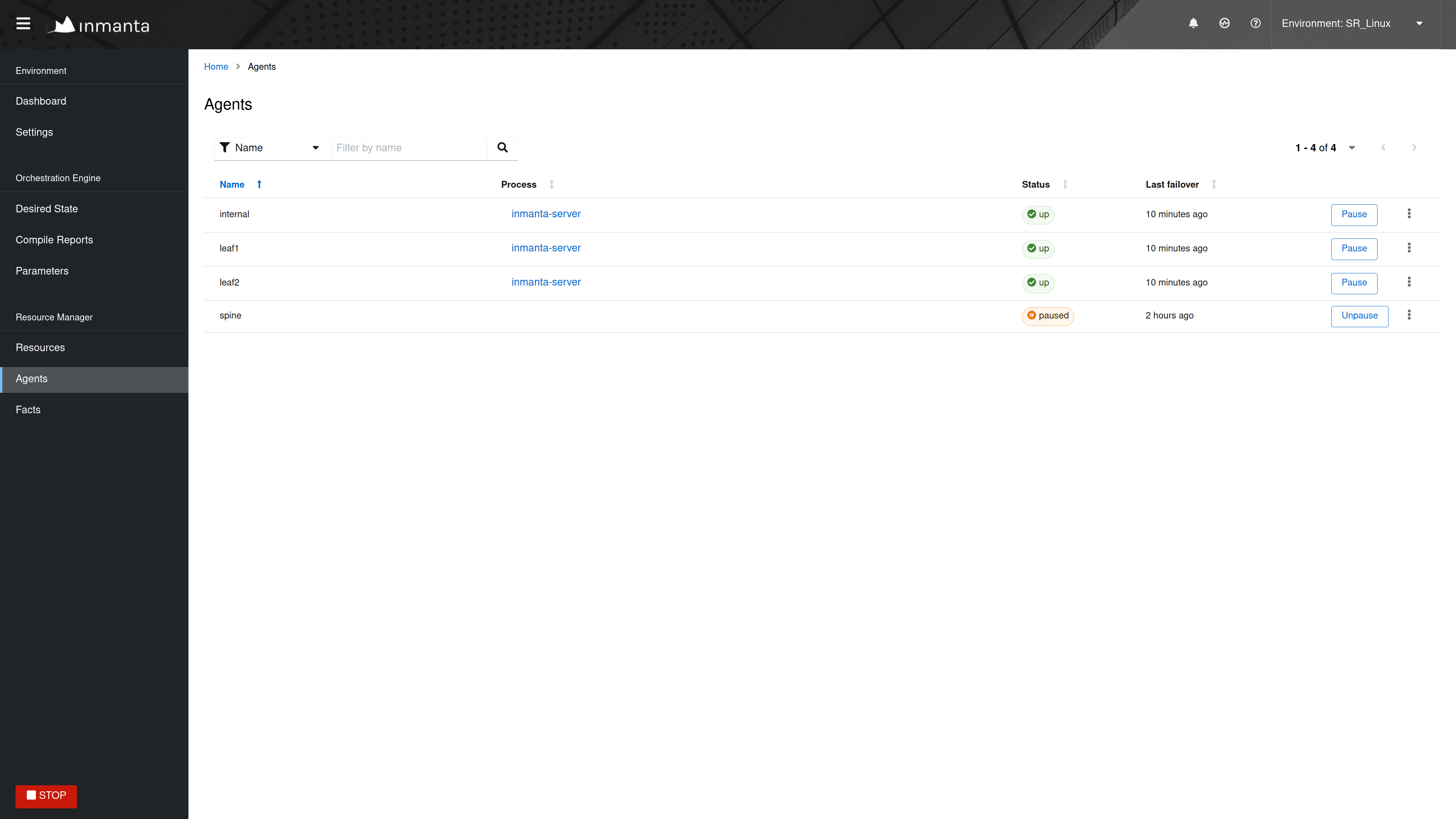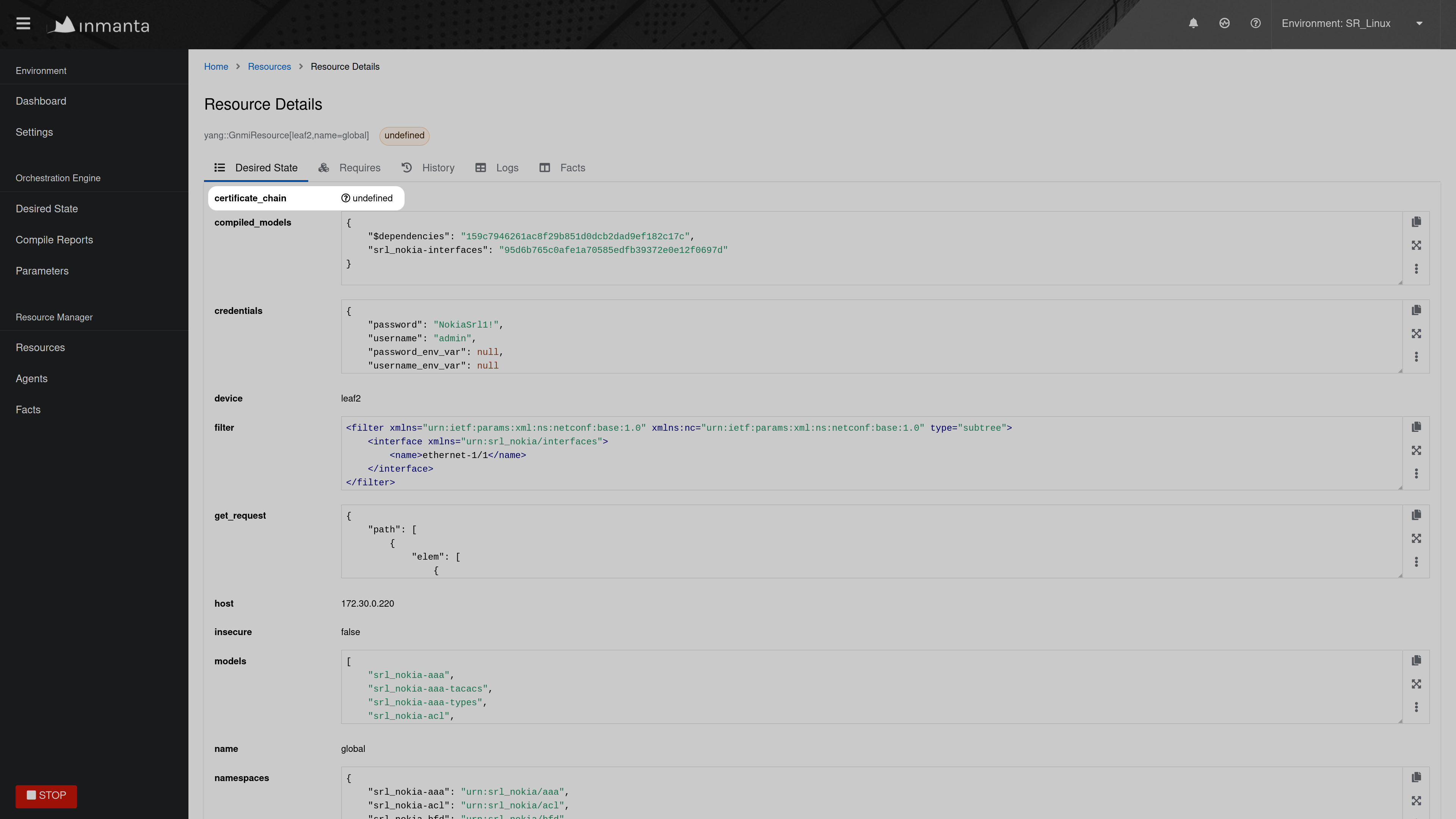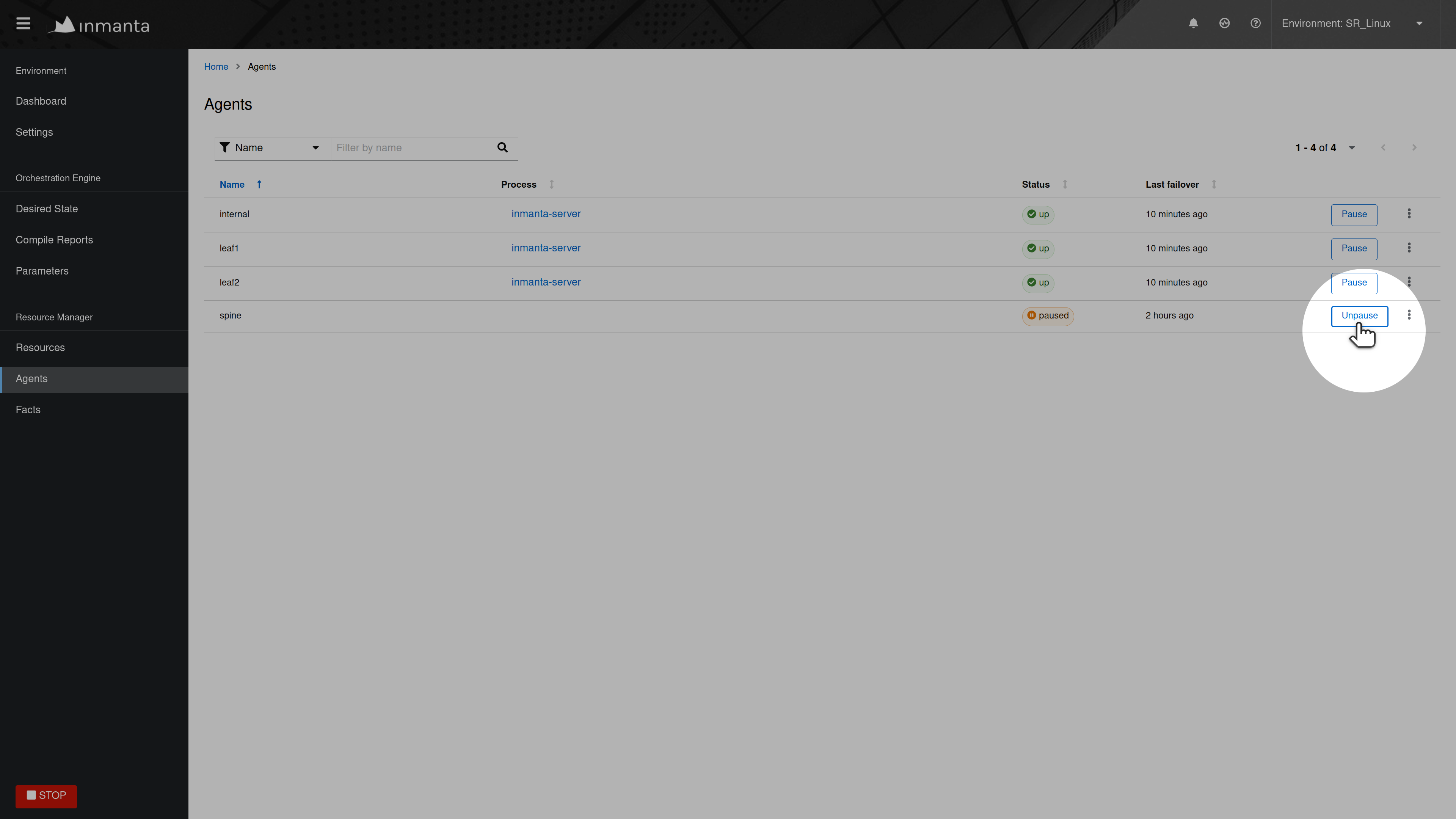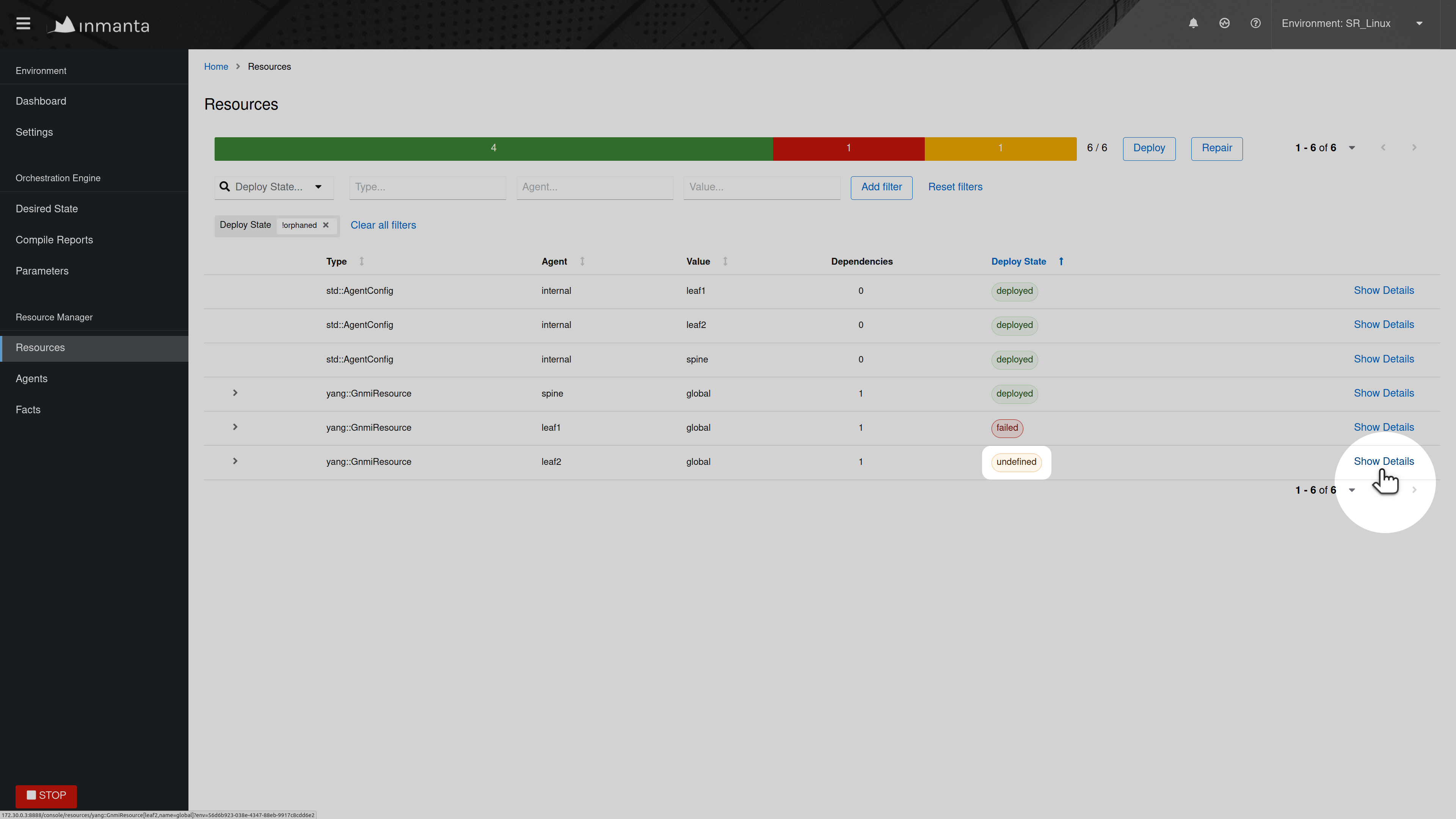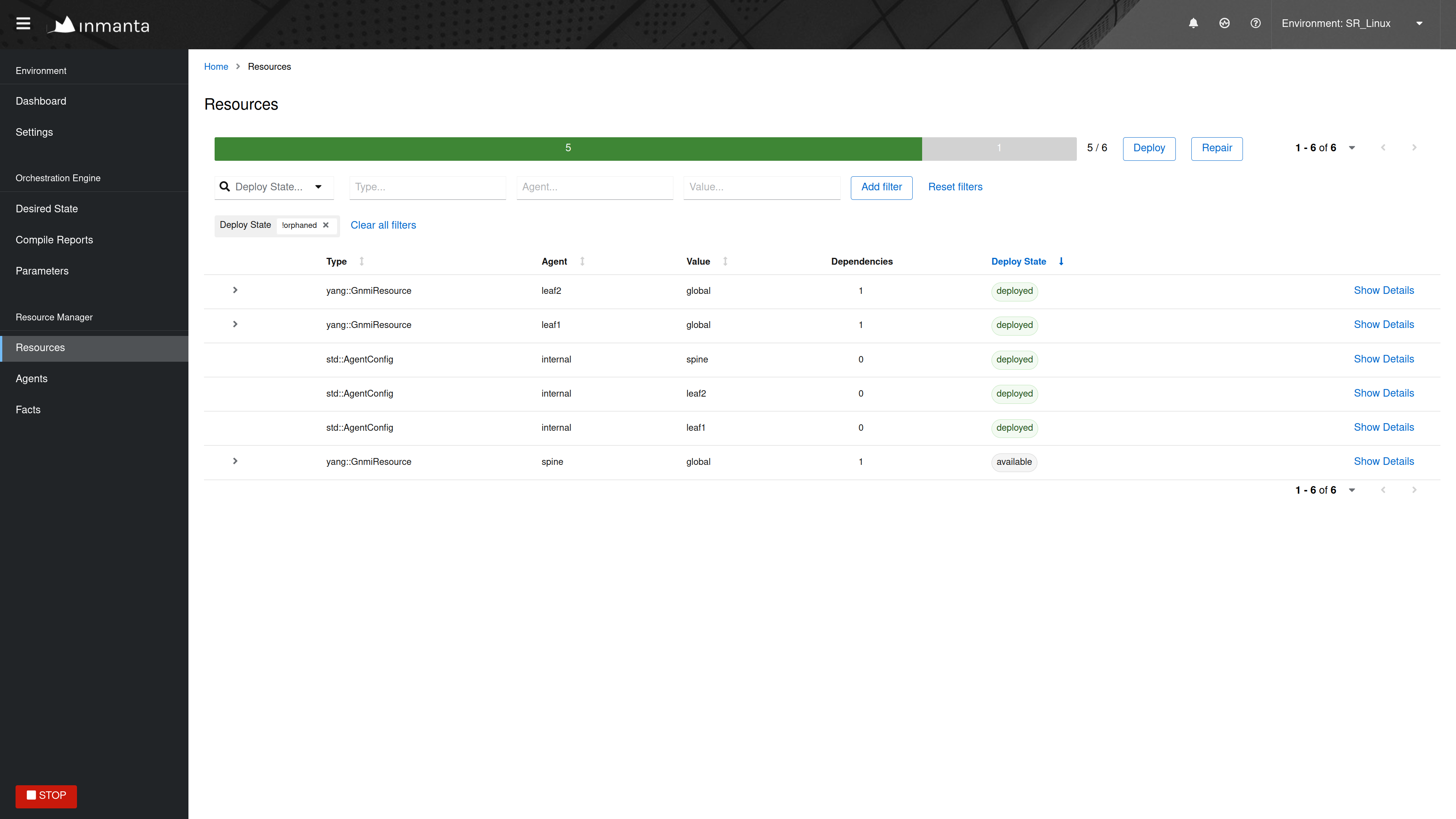 When a resource is stuck in the available state, it usually means that the agent, which should deploy the resource, is currently down or paused. Click on the Resources tab of the web-console, to get an overview of the different resources in the model. This overview shows the state of each resource and the name of its agent. Filter on resources in the available state and check which resource are ready to be deployed (i.e. a resource without dependencies or a resource for which all dependencies were deployed successfully). The agent of that resource, is the agent that causes the problem. In the figure below, the global GnmiResource should be ready to deploy on the spine agent.