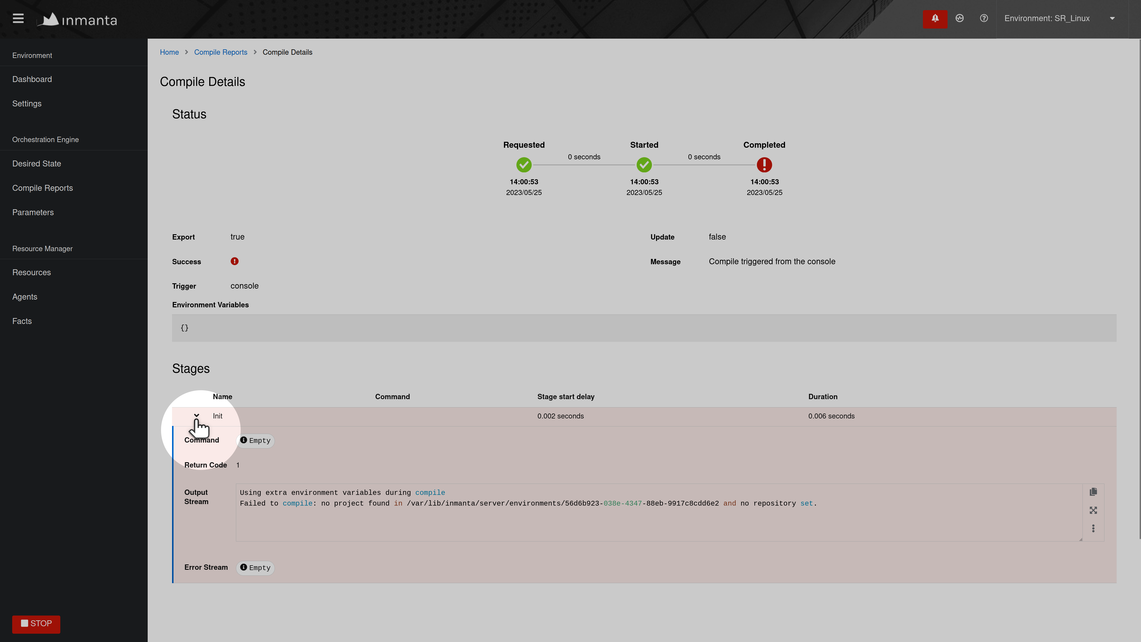 Each step of the compile process is shown. Click on the chevron, as shown below, for a specific step, to display more information such as the output produced by that step and the return code. Verify that the timestamp of the compile report corresponds to the time the compilation was triggered in the web-console. If no compile report was generated or the compile report doesn’t show any errors, check the server logs as well. By default the server log is present in <config.log-dir>/server.log.