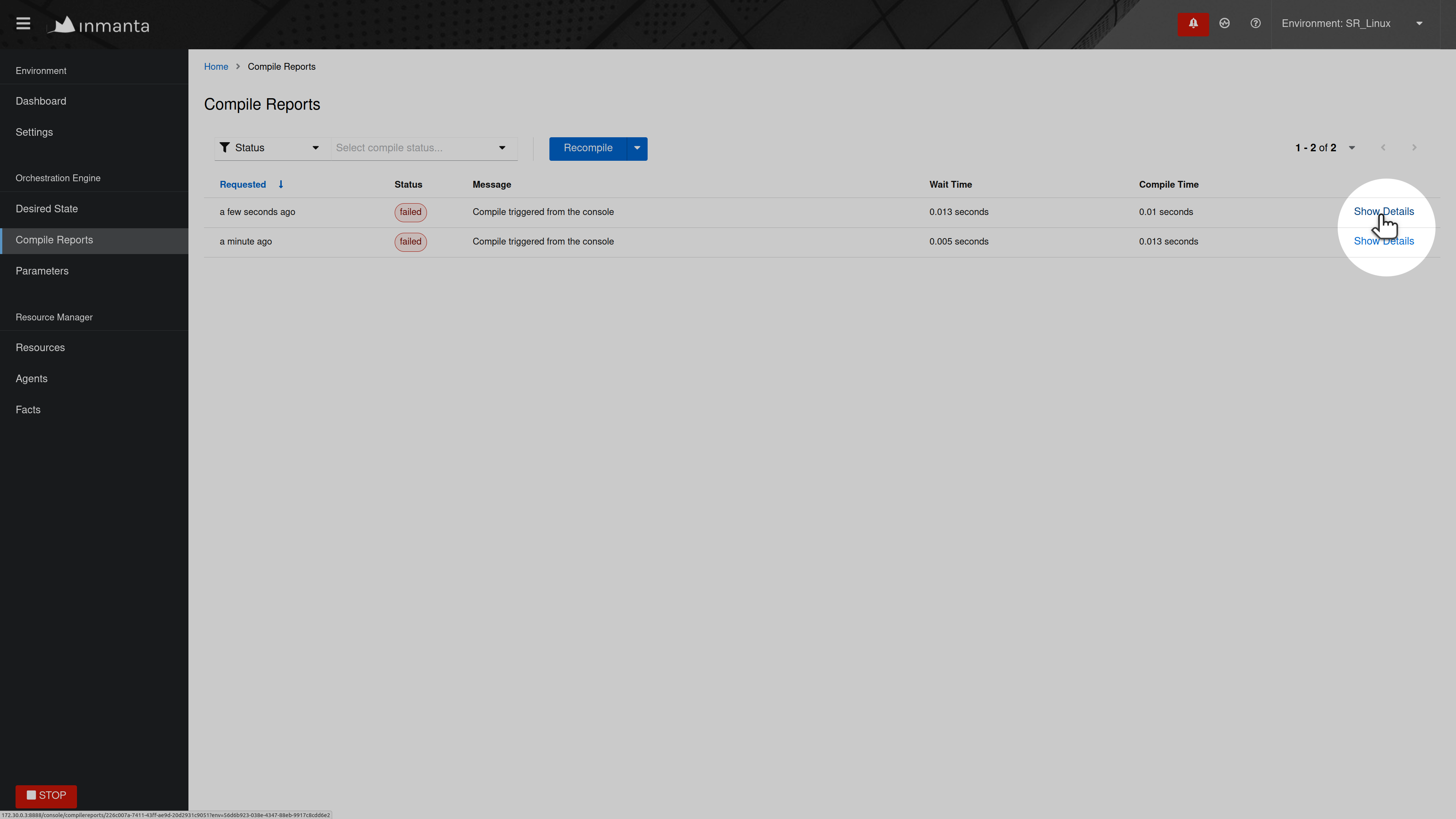 You can trigger a recompilation from the Compile Reports tab. It shows a list of compile reports for the latest compilations. Click on Show Details to see more information about a given report.