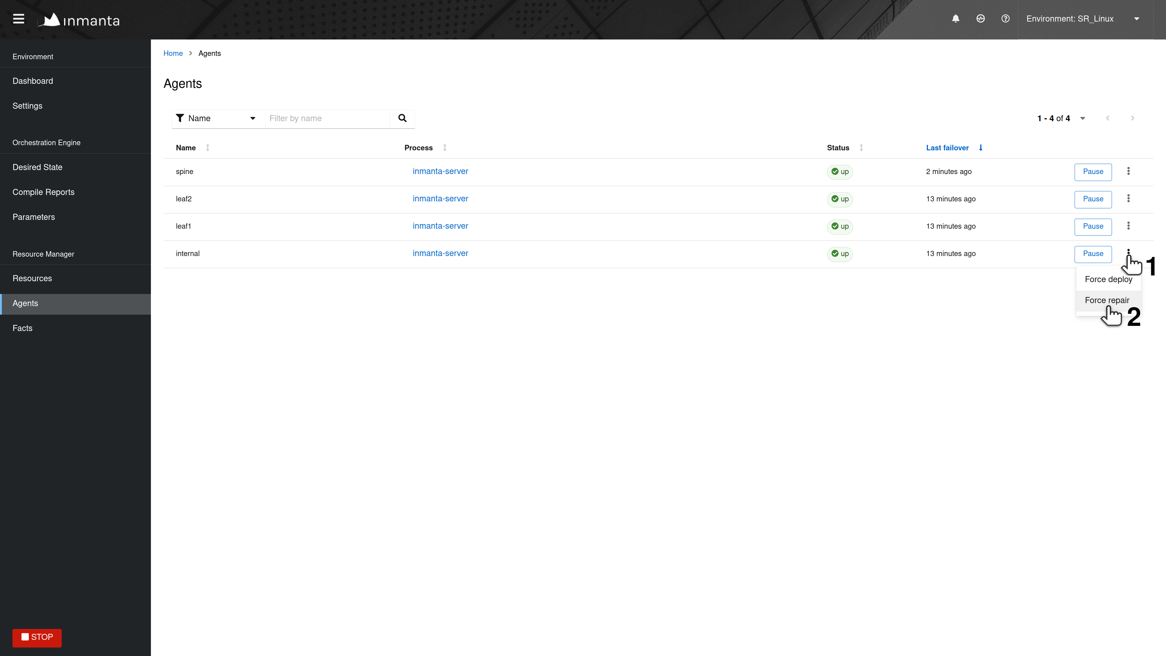 When the agent is in the up state, it should be ready to deploy resources. Read the agent log to verify it doesn’t contain error or warning messages that would explain why the agent is not deploying any resources. For auto-started agents, three different log files exist. The log files are present in <config.log-dir>/agent-<environment-id>.[log|out|err]. The environment ID can be found in the URL of the web-console, or in the Settings tab. More information about the different log files can be found here. If the log file doesn’t provide any more information, trigger the agent to execute a deployment by clicking on the Force repair button in the Agents tab of the web-console, as shown in the figure below: